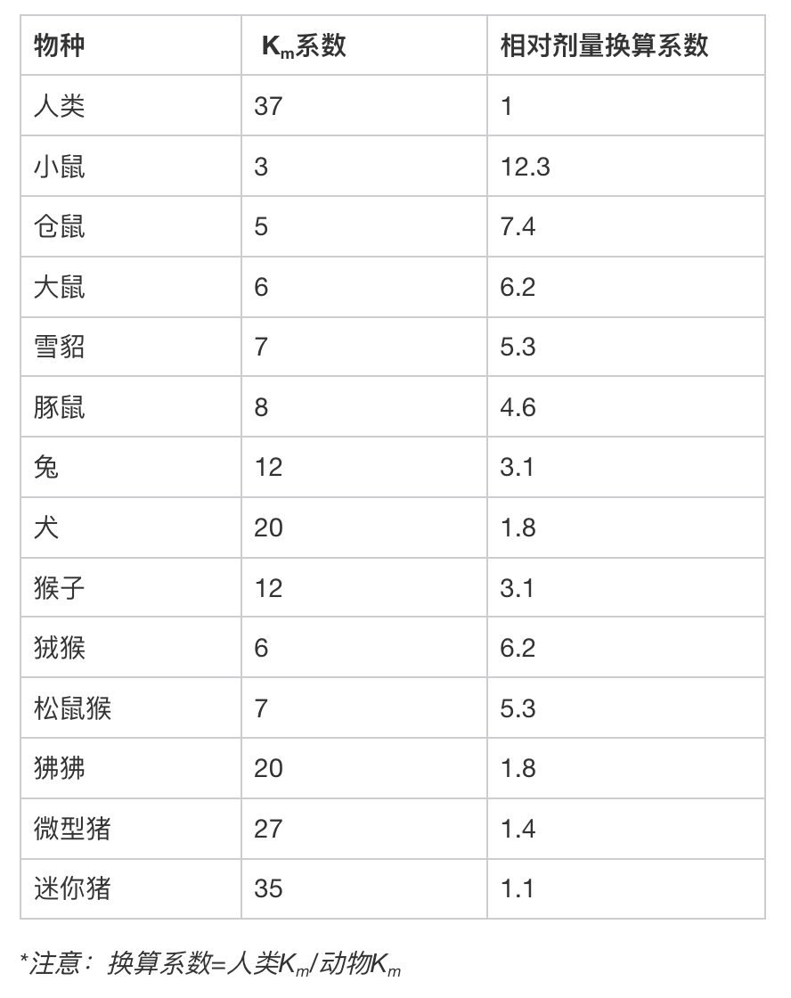根據(jù)美國(guó)FDA《Estimating the Maximum Safe Starting Dose in Initial Clinical Trials for Therapeutics in Adult Healthy Volunteers》,常見物種的Km系數(shù)以及相對(duì)劑量換算系數(shù)如下表: