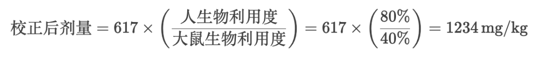 示例:延續(xù)上面的示例,剛剛我們計(jì)算出大鼠理論劑量是617mg/kg,假設(shè)目標(biāo)藥物在人體的口服生物利用度為80%,而在大鼠中僅為40%,生物利用度校正的計(jì)算過程如下: