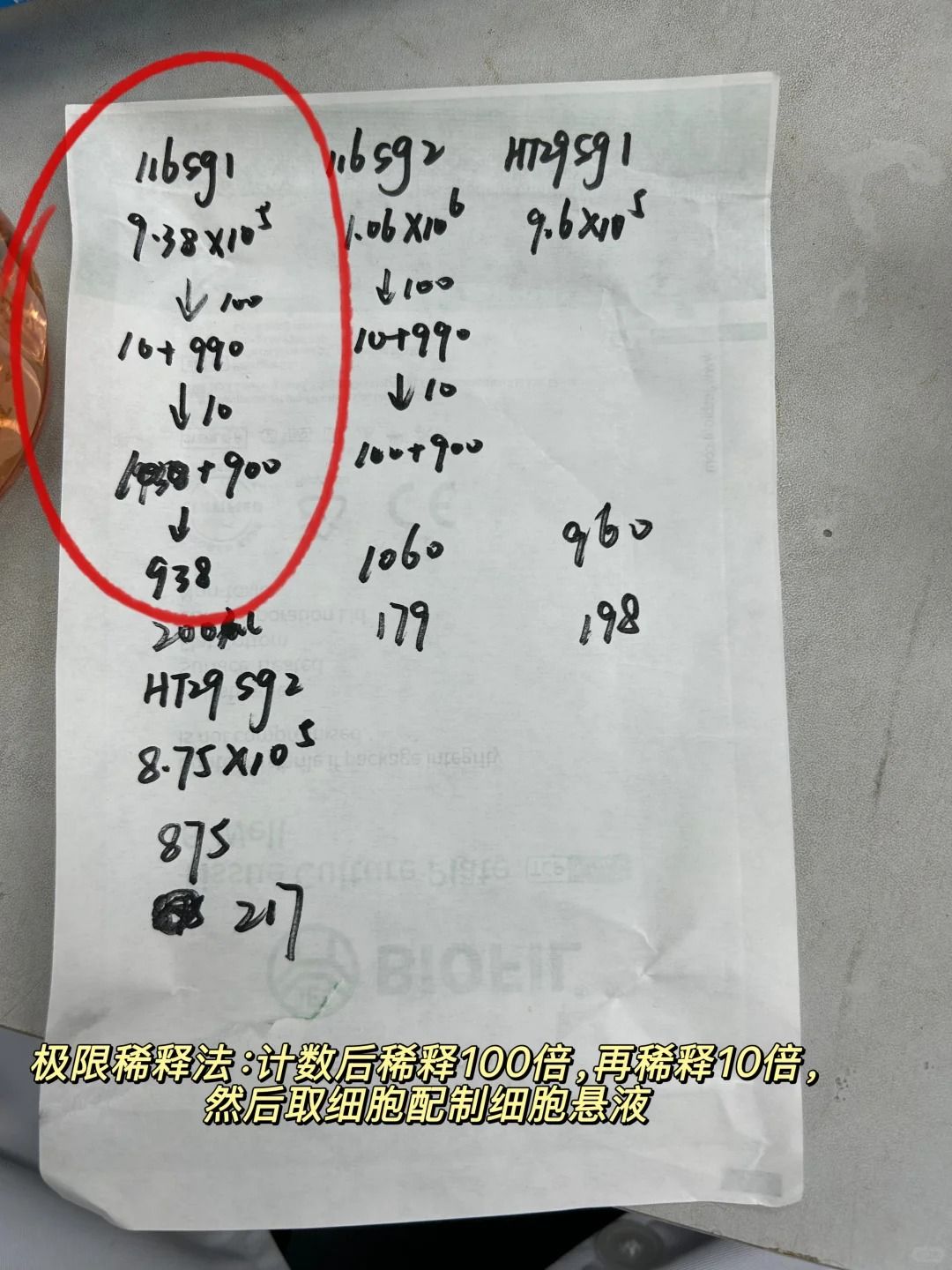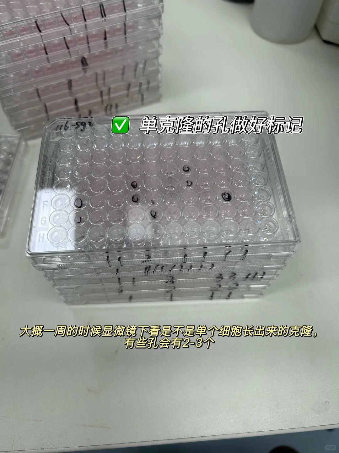 b.極限稀釋法:將細(xì)胞消化后計(jì)數(shù),取200個(gè)細(xì)胞制備細(xì)胞懸液(100mL培養(yǎng)基中含有一個(gè)細(xì)胞),取100L/孔接種于96孔板8.挑選單克隆細(xì)胞:96 孔板培養(yǎng)1-2周后顯微鏡下挑選出單個(gè)細(xì)胞克隆的孔,做好標(biāo)記并補(bǔ)加100mL培養(yǎng)基繼續(xù)培養(yǎng)1周左右(培養(yǎng)時(shí)間視細(xì)胞生長(zhǎng)情況而定)