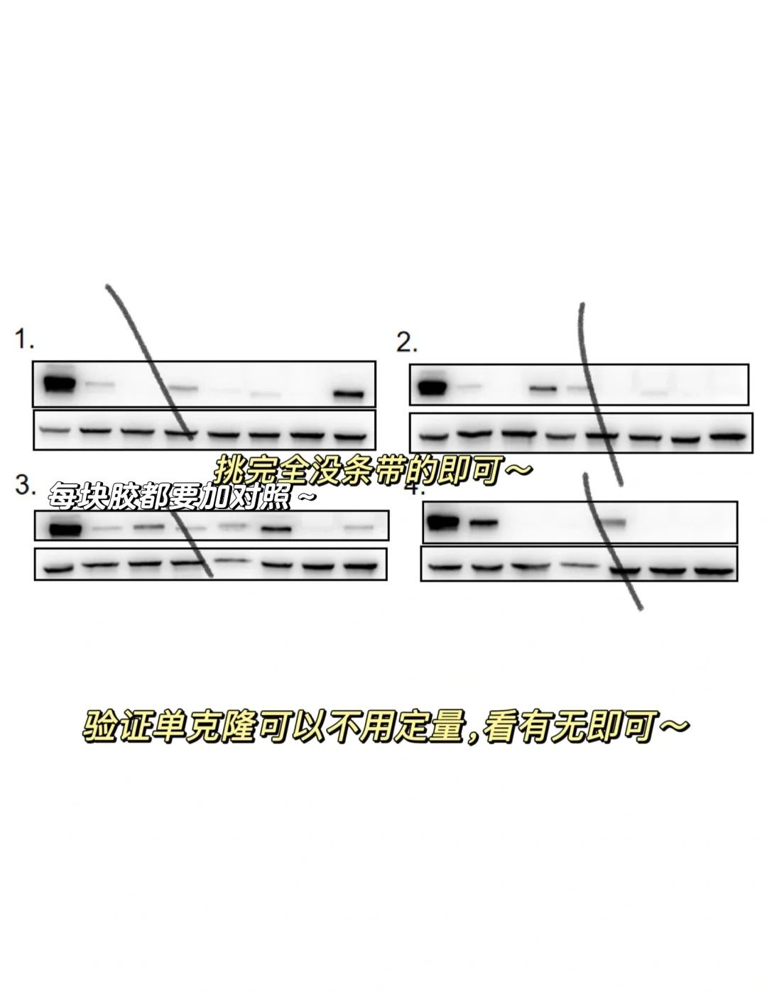 3.根據(jù)細(xì)胞生長(zhǎng)情況篩選 3-7天,鋪板提蛋白驗(yàn)證混合克隆的敲低效率,同時(shí)收細(xì)胞 DNA 進(jìn)行sanger 測(cè)序,根據(jù)測(cè)序結(jié)果和混合克隆敲低效率,選擇兩個(gè)片段(一般會(huì)有三個(gè)SgRNA)篩選單克隆細(xì)胞7.單克隆篩選:a.流式分選:提前在96孔板加好100mL/孔培養(yǎng)基,將細(xì)胞消化后上機(jī)分選即可,一個(gè)液滴只有一個(gè)細(xì)胞